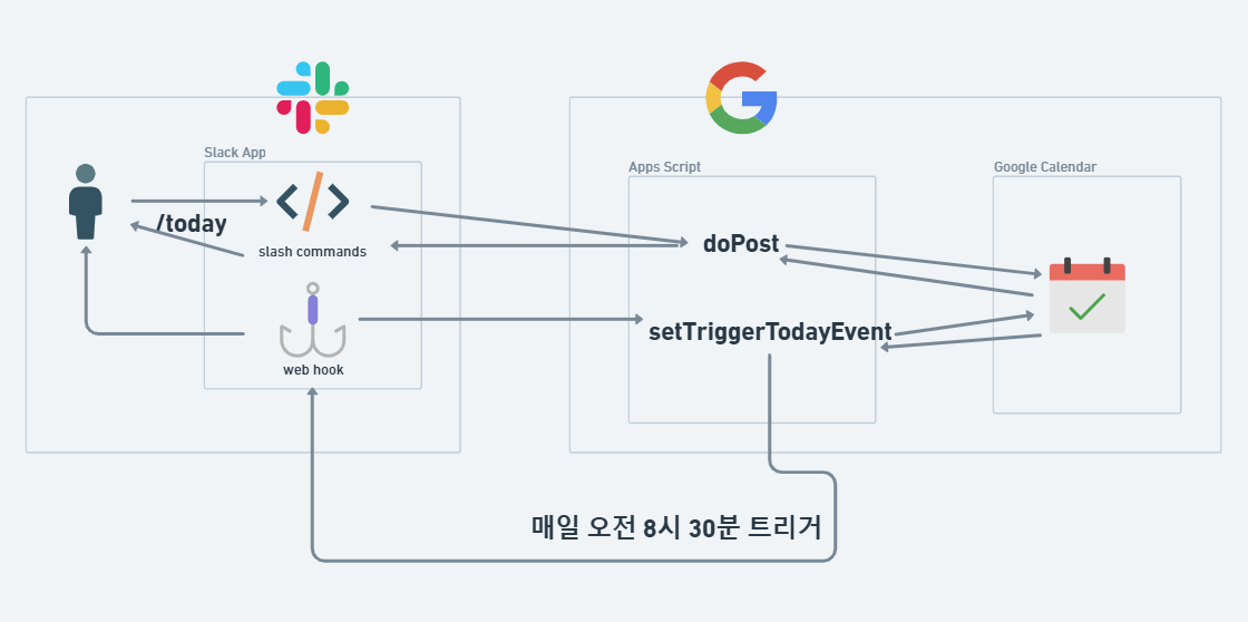 AWS의Lambda로 구현이 가능하지만 비용 절감 이슈로 인해 최대한 무료로 사용할 수 있는 범위의 기술 스택을 찾아보게 되었으며,Google Apps Script를 활용하여 구글 캘린더의 일정을 가져와 휴가자와 오늘의 회의 일정을 가져오며 아래와 같은Workflow흐름을 참고하시면 됩니다.