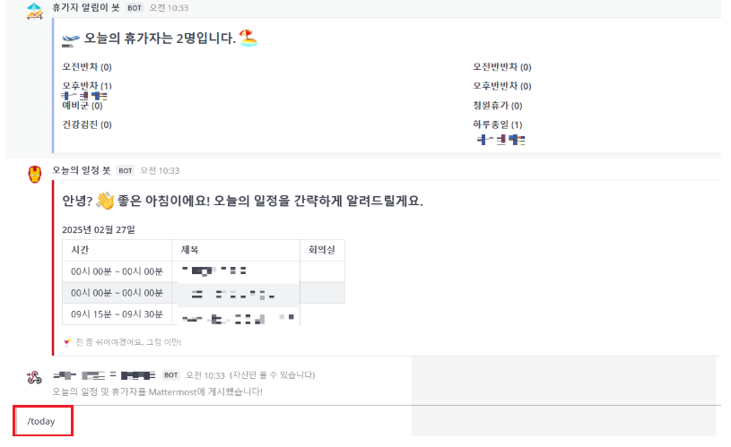 이번에도 비슷한 맥락에서, 사내 구성원들이 매일 아침 “오늘의 휴가자”와 “주요 일정”을 별도로 찾아보는 번거로움을 덜고, 중요한 정보가 모두에게 빠짐없이 전달될 수 있도록 구글 캘린더 정보를 자동으로 수집하여 메신저(슬랙·Mattermost 등)에 알림을 전송하는 오늘의 일정·휴가자 알림이 봇을 제작하게 되었습니다.